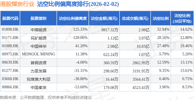 从沽空比例偏离度来看,中煤能源、兖矿能源、中国神华沽空比例偏离度位居行业前三,分别为125.33%、120.06%、41.2%。