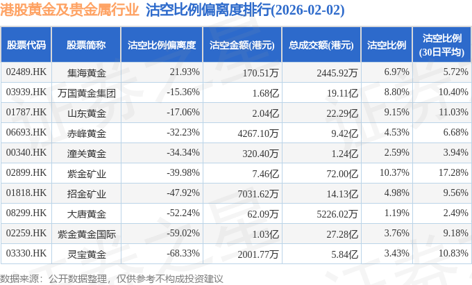 从沽空比例偏离度来看,集海黄金、万国黄金集团、山东黄金沽空比例偏离度位居行业前三,分别为21.93%、-15.36%、-17.06%。