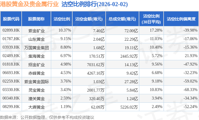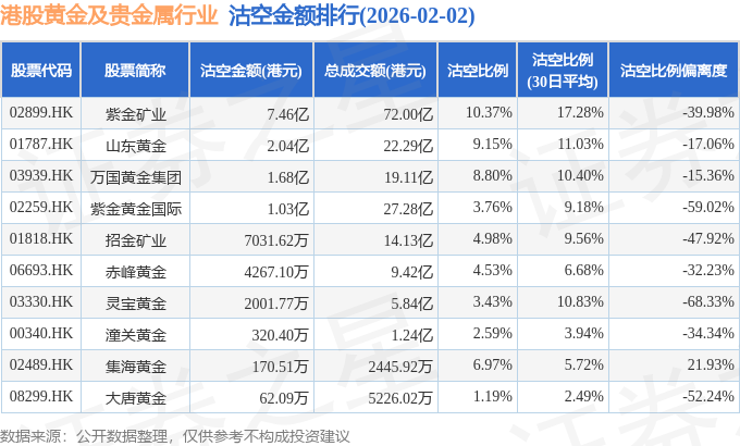 从沽空金额来看,紫金矿业、山东黄金、万国黄金集团沽空金额位居行业前三,分别为7.46亿港元、2.04亿港元、1.68亿港元。