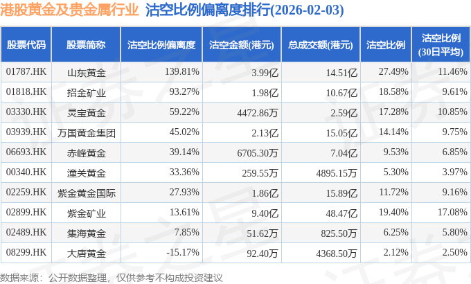 证券之星消息,2月3日港交所披露数据显示,当日港股黄金及贵金属行业的19只个股中有10只被沽空,总沽空股数为6126.85万股,总沽空金额为20.52亿元(港元),而当日黄金及贵金属行业的总成交金额为115.99亿元(港元),沽空比例为17.69%。当日黄金及贵金属行业总体涨6.71%。