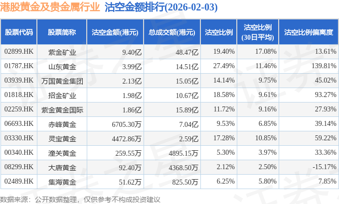 从沽空金额来看,紫金矿业、山东黄金、万国黄金集团沽空金额位居行业前三,分别为9.4亿港元、3.99亿港元、2.13亿港元。