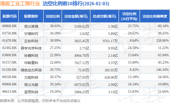从沽空比例来看,信义玻璃、宁德时代、丘钛科技沽空比例位居行业前三,分别为38.03%、34.28%、30.99%。