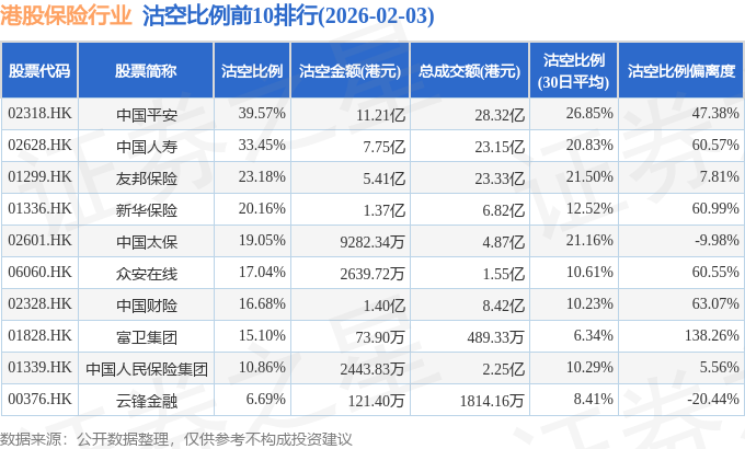 从沽空比例偏离度来看,富卫集团、中国财险、新华保险沽空比例偏离度位居行业前三,分别为138.26%、63.07%、60.99%。