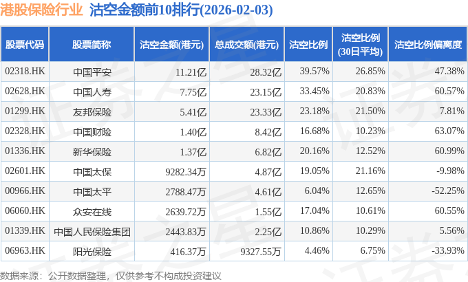 证券之星消息,2月3日港交所披露数据显示,当日港股保险行业的21只个股中有16只被沽空,总沽空股数为6655.65万股,总沽空金额为28.96亿元(港元),而当日保险行业的总成交金额为105.14亿元(港元),沽空比例为27.55%。当日保险行业总体涨0.9%。
