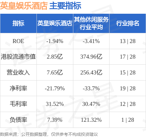 英皇娱乐酒店港股市值2.85亿港元,在其他休闲服务行业中排名第17。主要指标见下表: