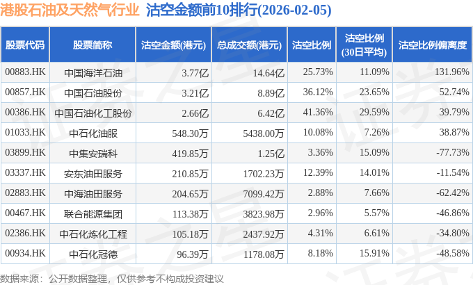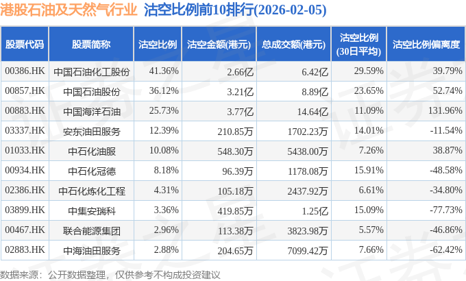 从沽空比例偏离度来看,中国海洋石油、中国石油股份、中国石油化工股份沽空比例偏离度位居行业前三,分别为131.96%、52.74%、39.79%。