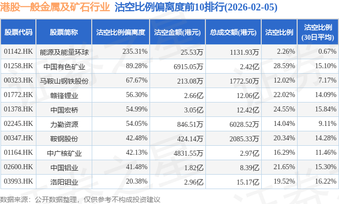 从沽空比例偏离度来看,能源及能量环球、中国有色矿业、马鞍山钢铁股份沽空比例偏离度位居行业前三,分别为235.31%、89.28%、67.67%。