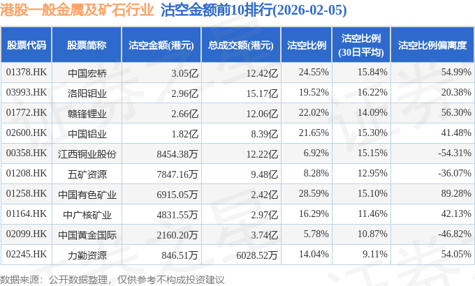 从沽空金额来看,中国宏桥、洛阳钼业、赣锋锂业沽空金额位居行业前三,分别为3.05亿港元、2.96亿港元、2.66亿港元。