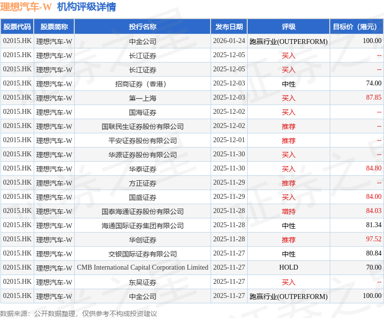 投行对该股的评级以买入为主,近90天内共有8家投行给出买入评级,近90天的目标均价为85.85港元。中金公司最新一份研报给予理想汽车-W跑赢行业(OUTPERFORM)评级,目标价100港元。