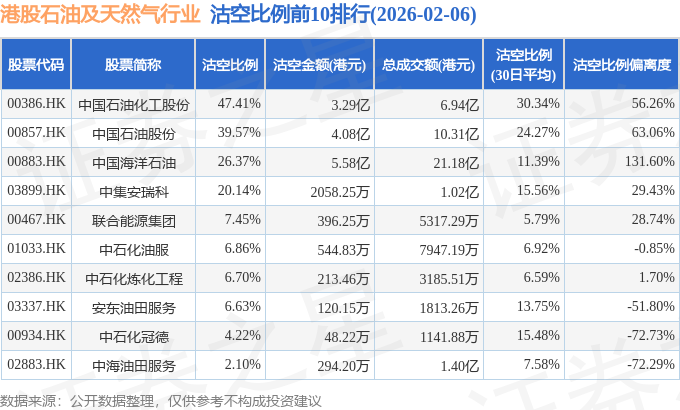 从沽空比例来看,中国石油化工股份、中国石油股份、中国海洋石油沽空比例位居行业前三,分别为47.41%、39.57%、26.37%。