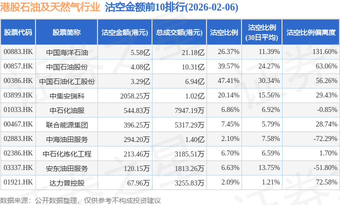 从沽空金额来看,中国海洋石油、中国石油股份、中国石油化工股份沽空金额位居行业前三,分别为5.58亿港元、4.08亿港元、3.29亿港元。