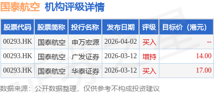截至2026年4月17日收盘,国泰航空(00293.HK)报收于11.61港元,下跌2.35%,成交量1027.12万股,成交额1.2亿港元。投行对该股的评级以买入为主,近90天内共有2家投行给出买入评级,近90天的目标均价为15.5港元。申万宏源最新一份研报给予国泰航空买入评级。