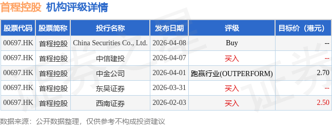 截至2026年4月20日收盘,首程控股(00697.HK)报收于1.67港元,上涨0.6%,成交量2577.4万股,成交额4256.98万港元。投行对该股的评级以买入为主,近90天内共有3家投行给出买入评级,近90天的目标均价为2.6港元。China Securities Co., Ltd.最新一份研报给予首程控股Buy评级。