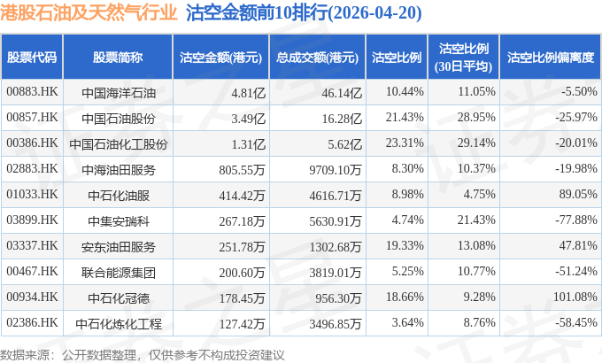 从沽空金额来看,中国海洋石油、中国石油股份、中国石油化工股份沽空金额位居行业前三,分别为4.81亿港元、3.49亿港元、1.31亿港元。