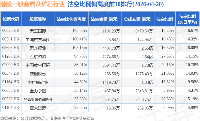 从沽空比例偏离度来看,天工国际、中国东方集团、天齐锂业沽空比例偏离度位居行业前三,分别为175.68%、160.41%、105.13%。