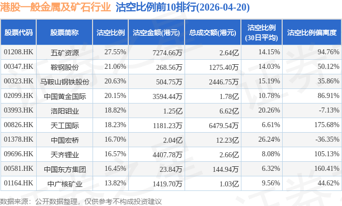 证券之星消息,4月20日港交所披露数据显示,当日港股一般金属及矿石行业的65只个股中有25只被沽空,总沽空股数为3692.75万股,总沽空金额为6.62亿元(港元),而当日一般金属及矿石行业的总成交金额为50.82亿元(港元),沽空比例为13.02%。当日一般金属及矿石行业总体跌0.56%。