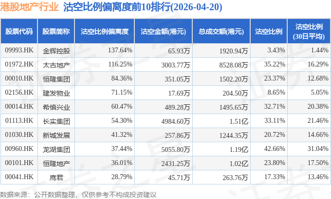 从沽空比例偏离度来看,金辉控股、太古地产、恒隆集团沽空比例偏离度位居行业前三,分别为137.64%、116.25%、84.36%。