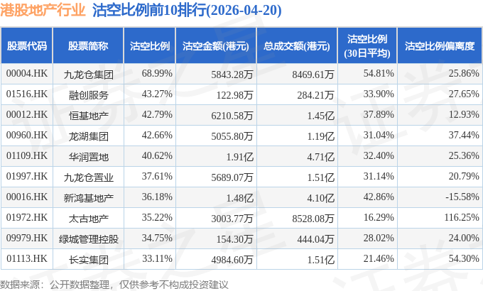 从沽空比例来看,九龙仓集团、融创服务、恒基地产沽空比例位居行业前三,分别为68.99%、43.27%、42.79%。