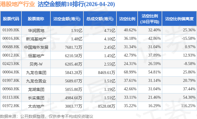 从沽空金额来看,华润置地、新鸿基地产、中国海外发展沽空金额位居行业前三,分别为1.91亿港元、1.48亿港元、7681.72万港元。