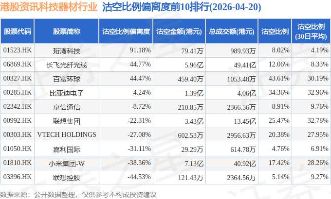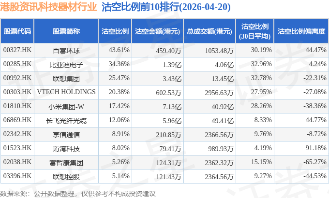 从沽空比例来看,百富环球、比亚迪电子、联想集团沽空比例位居行业前三,分别为43.61%、34.36%、25.47%。