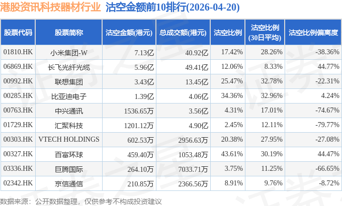从沽空金额来看,小米集团-W、长飞光纤光缆、联想集团沽空金额位居行业前三,分别为7.13亿港元、5.96亿港元、3.43亿港元。