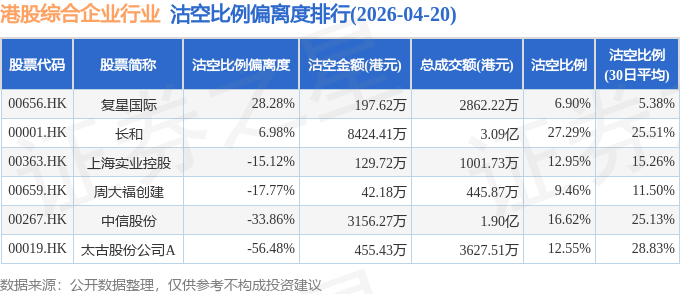 从沽空比例偏离度来看,复星国际、长和、上海实业控股沽空比例偏离度位居行业前三,分别为28.28%、6.98%、-15.12%。