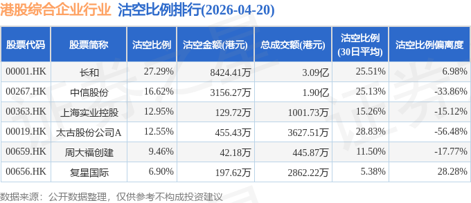 从沽空比例来看,长和、中信股份、上海实业控股沽空比例位居行业前三,分别为27.29%、16.62%、12.95%。