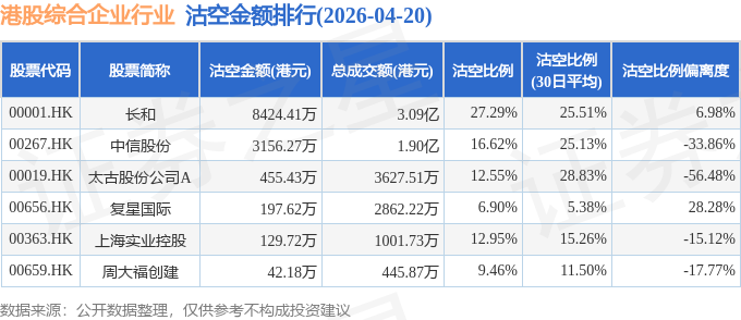 从沽空金额来看,长和、中信股份、太古股份公司A沽空金额位居行业前三,分别为8424.41万港元、3156.27万港元、455.43万港元。