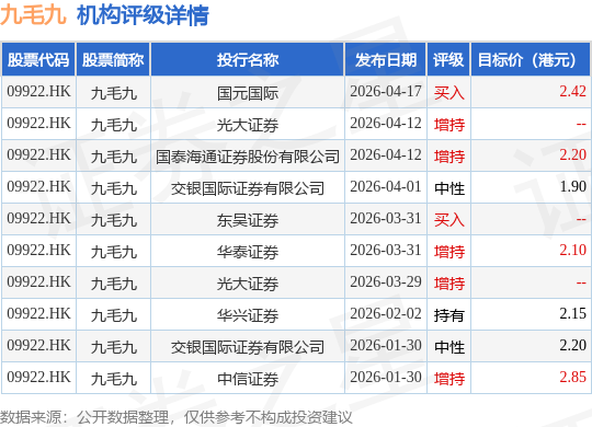 截至2026年4月20日收盘,九毛九(09922.HK)报收于1.92港元,下跌1.03%,成交量256.2万股,成交额489.88万港元。投行对该股的评级以增持为主,近90天内共有5家投行给出增持评级,近90天的目标均价为2.26港元。国元国际最新一份研报给予九毛九买入评级,目标价2.42港元。