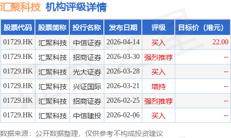 截至2026年4月20日收盘,汇聚科技(01729.HK)报收于21.82港元,上涨3.71%,成交量2242.78万股,成交额4.9亿港元。投行对该股的评级以买入为主,近90天内共有3家投行给出买入评级,近90天的目标均价为22港元。中信证券最新一份研报给予汇聚科技买入评级,目标价22港元。