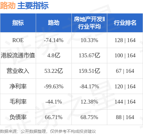 路劲港股市值4.8亿港元,在房地产开发Ⅱ行业中排名第100。主要指标见下表:
