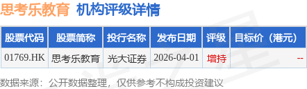 截至2026年4月21日收盘,思考乐教育(01769.HK)报收于1.72港元,上涨1.18%,成交量21.0万股,成交额35.93万港元。投行对该股的评级以增持为主,近90天内共有1家投行给出增持评级。光大证券最新一份研报给予思考乐教育增持评级。