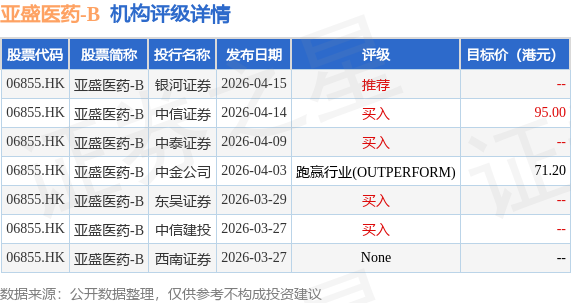 投行对该股的评级以买入为主,近90天内共有4家投行给出买入评级,近90天的目标均价为83.1港元。银河证券最新一份研报给予亚盛医药-B推荐评级。