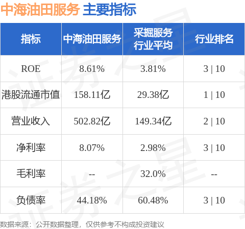 中海油田服务港股市值158.11亿港元,在采掘服务行业中排名第1。主要指标见下表: