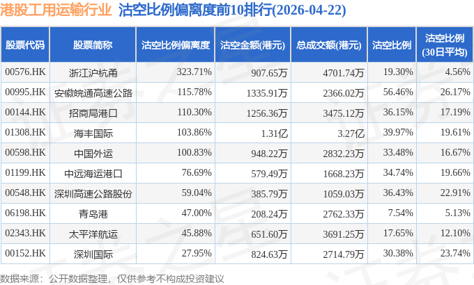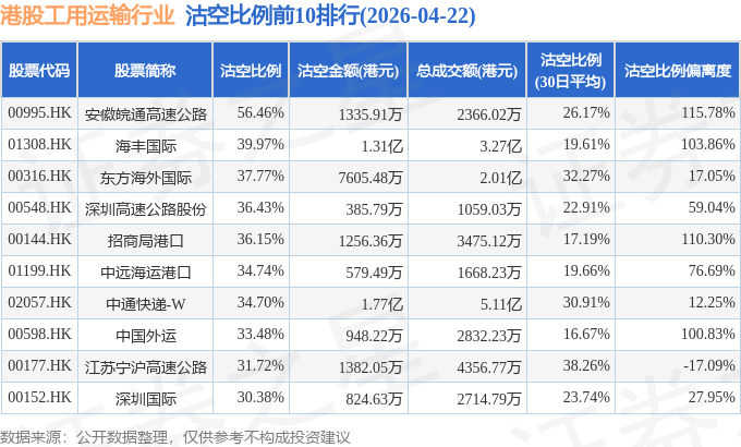 从沽空比例来看,安徽皖通高速公路、海丰国际、东方海外国际沽空比例位居行业前三,分别为56.46%、39.97%、37.77%。