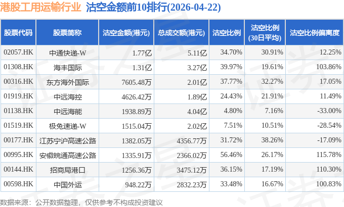 从沽空金额来看,中通快递-W、海丰国际、东方海外国际沽空金额位居行业前三,分别为1.77亿港元、1.31亿港元、7605.48万港元。