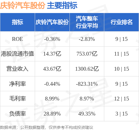 庆铃汽车股份港股市值14.37亿港元,在汽车整车行业中排名第11。主要指标见下表: