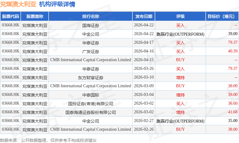 投行对该股的评级以买入为主,近90天内共有5家投行给出买入评级,近90天的目标均价为46.64港元。国海证券最新一份研报给予兖煤澳大利亚买入评级。