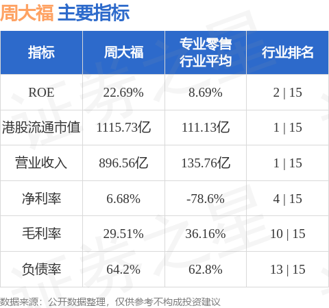 周大福港股市值1115.73亿港元,在专业零售行业中排名第1。主要指标见下表: