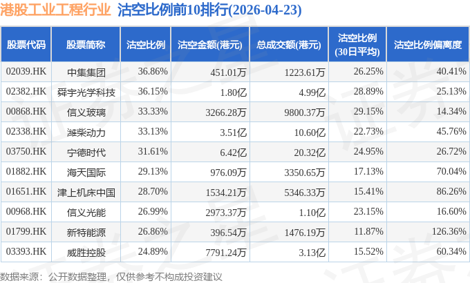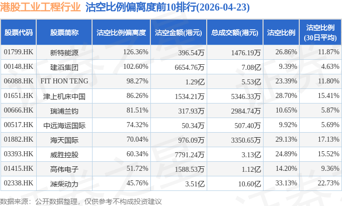 从沽空比例偏离度来看,新特能源、建滔集团、FIT HON TENG沽空比例偏离度位居行业前三,分别为126.36%、102.6%、98.27%。