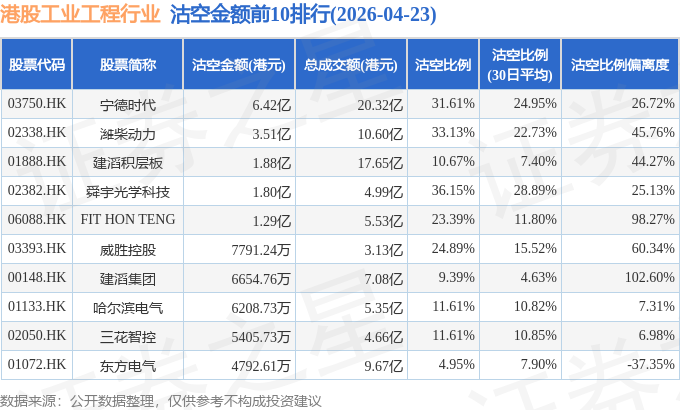 从沽空金额来看,宁德时代、潍柴动力、建滔积层板沽空金额位居行业前三,分别为6.42亿港元、3.51亿港元、1.88亿港元。