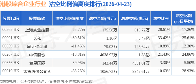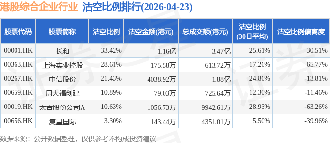 从沽空比例来看,长和、上海实业控股、中信股份沽空比例位居行业前三,分别为33.42%、28.61%、21.43%。