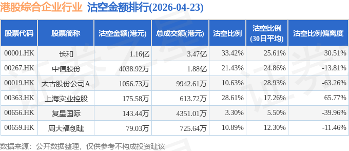 从沽空金额来看,长和、中信股份、太古股份公司A沽空金额位居行业前三,分别为1.16亿港元、4038.92万港元、1056.73万港元。
