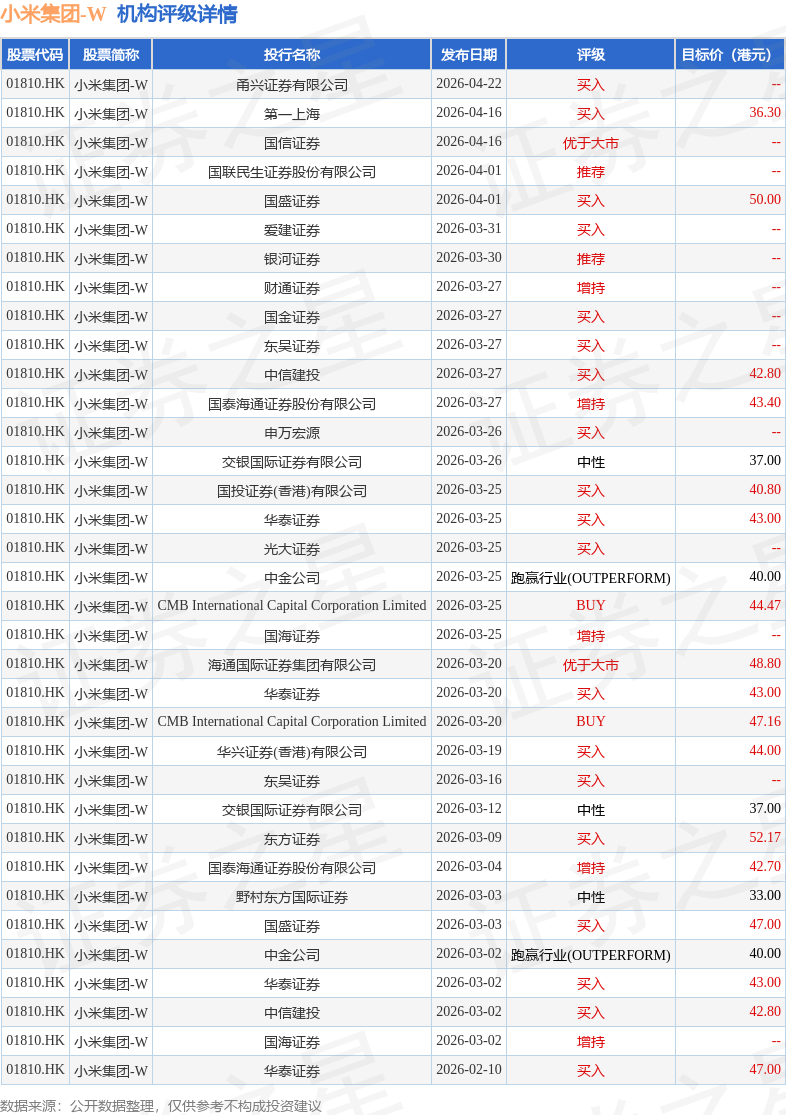 截至2026年4月23日收盘,小米集团-W(01810.HK)报收于31.18港元,下跌1.95%,成交量1.35亿股,成交额42.05亿港元。投行对该股的评级以买入为主,近90天内共有19家投行给出买入评级,近90天的目标均价为42.97港元。甬兴证券有限公司最新一份研报给予小米集团-W买入评级。