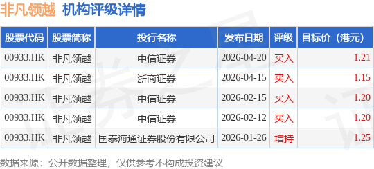 截至2026年4月23日收盘,非凡领越(00933.HK)报收于0.54港元,与上一交易日持平,成交量51.2万股,成交额28.42万港元。投行对该股的评级以买入为主,近90天内共有4家投行给出买入评级,近90天的目标均价为1.2港元。中信证券最新一份研报给予非凡领越买入评级,目标价1.21港元。