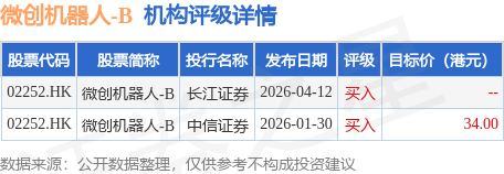 截至2026年4月24日收盘,微创机器人-B(02252.HK)报收于32.4港元,下跌2.41%,成交量540.79万股,成交额1.74亿港元。投行对该股的评级以买入为主,近90天内共有2家投行给出买入评级,近90天的目标均价为34港元。长江证券最新一份研报给予微创机器人-B买入评级。
