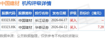 截至2026年4月24日收盘,中国建材(03323.HK)报收于5.03港元,与上一交易日持平,成交量2746.28万股,成交额1.37亿港元。投行对该股的评级以买入为主,近90天内共有2家投行给出买入评级,近90天的目标均价为7.28港元。长江证券最新一份研报给予中国建材买入评级。