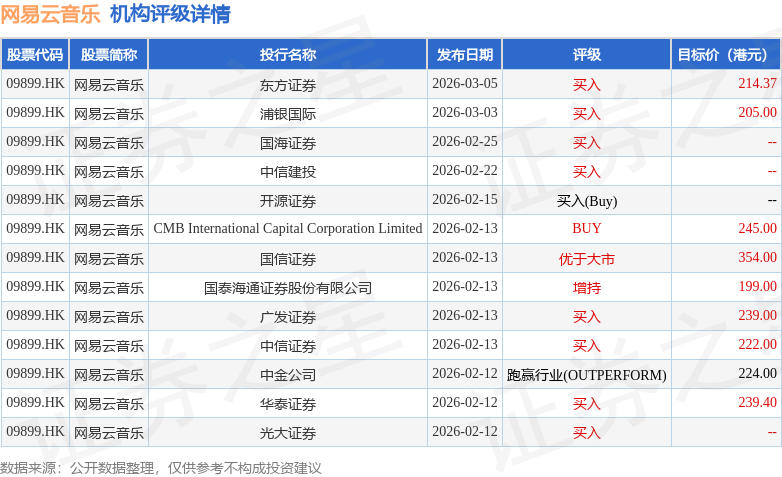 截至2026年4月24日收盘,网易云音乐(09899.HK)报收于119.1港元,下跌0.75%,成交量67.91万股,成交额8001.08万港元。投行对该股的评级以买入为主,近90天内共有8家投行给出买入评级,近90天的目标均价为237.97港元。东方证券最新一份研报给予网易云音乐买入评级,目标价214.37港元。