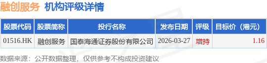截至2026年4月27日收盘,融创服务(01516.HK)报收于0.93港元,下跌1.06%,成交量484.08万股,成交额446.95万港元。投行对该股的评级以增持为主,近90天内共有1家投行给出增持评级,近90天的目标均价为1.16港元。国泰海通证券股份有限公司最新一份研报给予融创服务增持评级,目标价1.16港元。