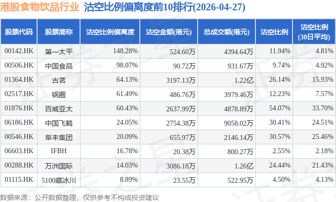 从沽空比例偏离度来看,第一太平、中国食品、古茗沽空比例偏离度位居行业前三,分别为148.28%、98.07%、64.13%。